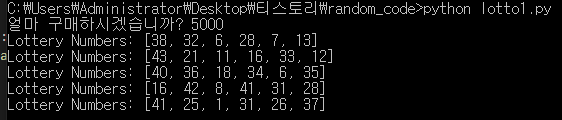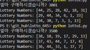 1 2 3 4 5 6 7 8 9 10 11 12 13 14 15 16 17 18 19 20 21 22 23 24 25 26 27 28 29 30 31 32 33 | import random # 로또 번호 생성 함수 def generate_lottery_numbers(money_cnt): lottery_numbers=[] count=6 start_range=1 end_range=45 # 잘못된 범위 확인 over_range_check(count, start_range, end_range) # 넣은 금액만큼 동작 for i in range(0, money_cnt): # Generate 6 unique random numbers lottery_numbers.append(random.sample(range(start_range, end_range), count)) return lottery_numbers # 로또 범위 확인 함수 def over_range_check(count, start_range, end_range): if count > (end_range - start_range + 1): raise ValueError("Cannot get unique random numbers. Over Range") # main 여기서 부터 실행 if __name__ == "__main__": # 입력시 정수 변환 money = int(input("얼마 구매하시겠습니까? ")) loop_output = generate_lottery_numbers(int(money/1000)) for i in loop_output: print("Lottery Numbers:", i) | cs |